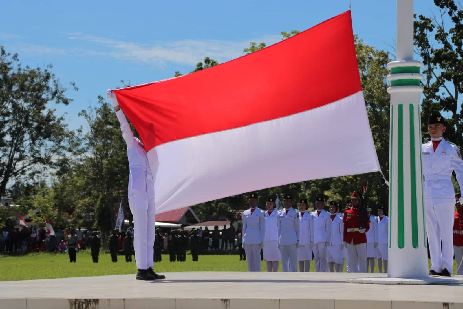 Pelaksanaan pengibaran Bendera merah putih oleh anggota Paskibraka Kabupaten Bolaang Mongondow utara tahun 2022 berjalan lancar dan khidmad.