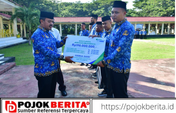 POJOKberita.id,POHUWATO,–Sekretaris Daerah Pohuwato, Iskandar Datau menyerahkan santunan jaminan kematian (JKM) dan santunan beasiswa anak kepada ahli waris almarhum Andris H. Pakaya pegawai cabang dinas (Cabdis) lemito dan alm. Hamzah Saini dari dinas pertanian yang masing-masing menerima dana sebesar Rp. 198 juta di halaman kantor bupati Disela-sela memimpin apel korpri. Senin, 19 September 2022.