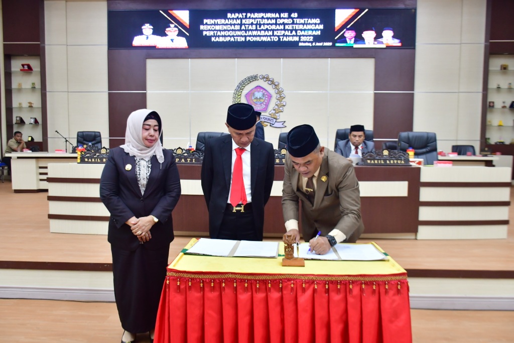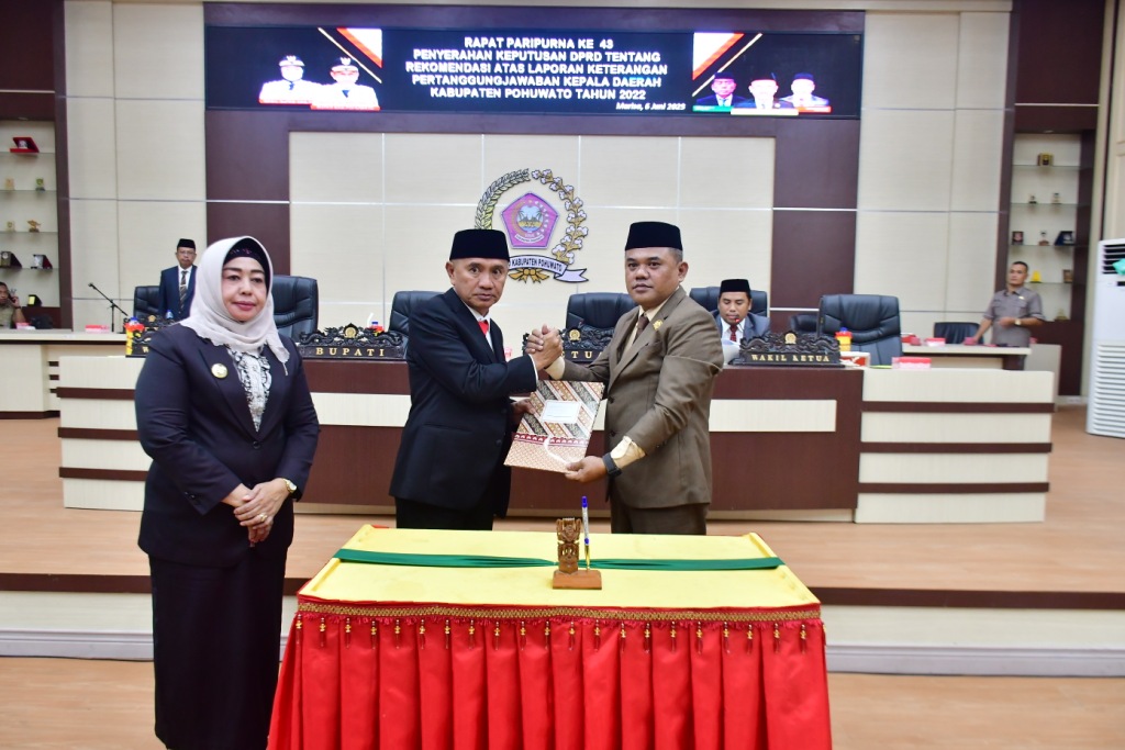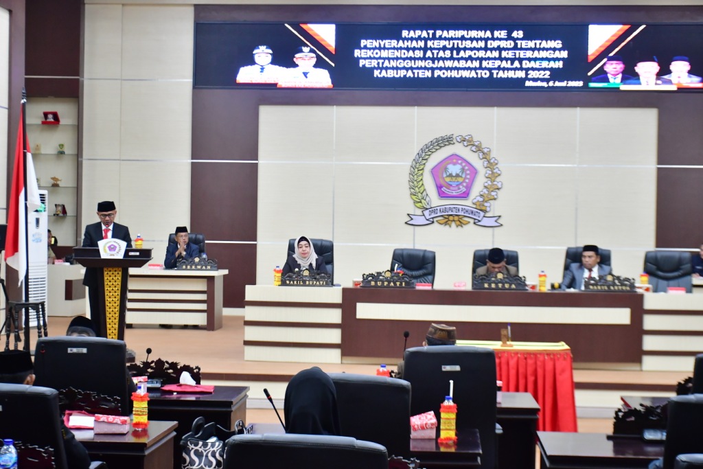 POJOKberita.id,POHUWATO__Bupati Pohuwato, Saipul A. Mbuinga bersama Wakil Bupati, Suharsi Igirisa menghadiri rapat paripurna penyerahan keputusan DPRD tentang rekomendasi atas laporan keterangan pertanggung jawaban (LKPJ) kepala daerah Kabupaten Pohuwato tahun 2022. Paripuran yang berlangsung di ruang rapat DPRD Pohuwato.