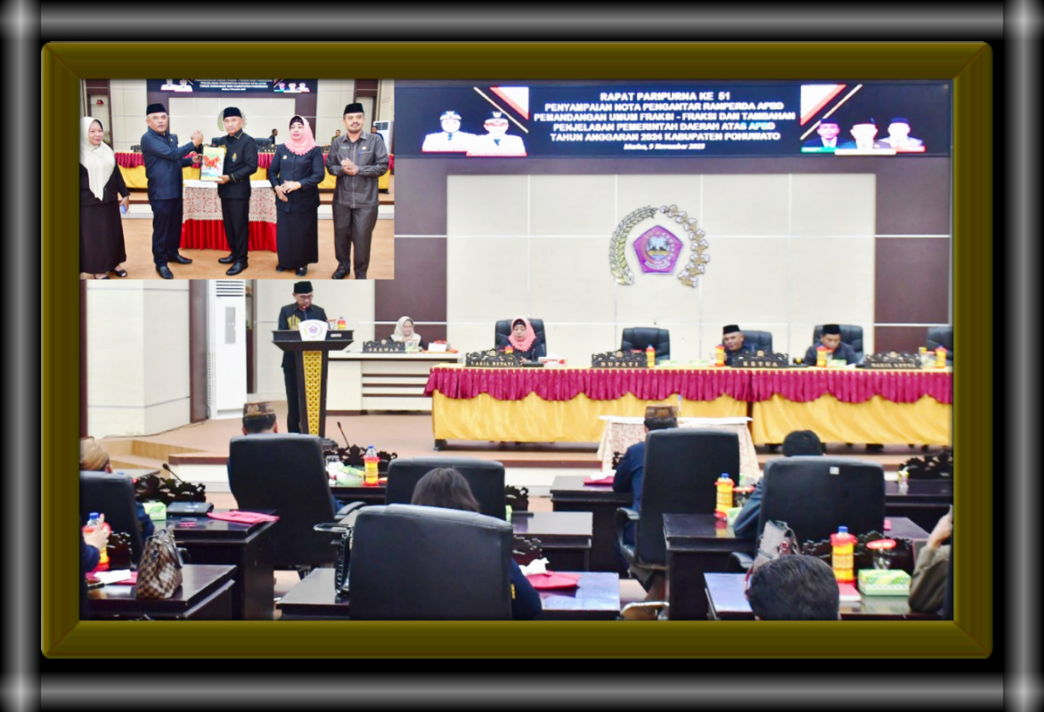 POJOKberita.ID,POHUWATO__Bupati Pohuwato, Saipul A. Mbuinga menyerahkan dokumen Rancangan Anggaran Pendapatan dan Belanja Daerah (RAPBD) Kabupaten Pohuwato tahun 2024 yang diterima Ketua DPRD Pohuwato, Nasir Giasi pada Rapat Paripurna di ruang sidang DPRD Pohuwato, Kamis, (9/11/2023).