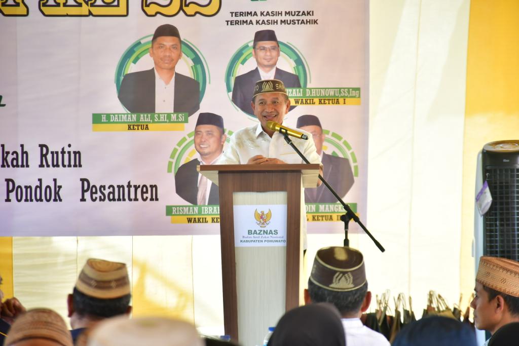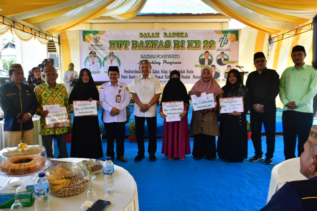 POJOKberita.id,POHUWATO__Menghadiri HUT ke-22 Badan Amil Zakat Nasional (Baznas) Republik Indonesia, Bupati Pohuwato, Saipul A. Mbuinga melaunching program pendistribusian dana zakat dan infaq sedekah rutin, untuk panti asuhan, anak yatim, rumah tahfiz dan pondok pesantren.