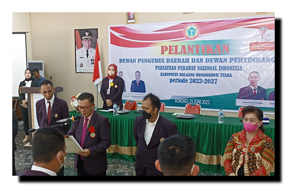 POJOKberita.id, BOLMUT __ Ketua Dewan Pimpinan Wilayah (DPW) Persatuan Perawat Nasional Indonesia (PPNI) Provinsi Sulawesi Utara Ns. Suwandi Luneto SKM M. Kes, secara Resmi melantik Dewan Pengurus Daerah dan Dewan Pertimbangan PPNI Kabupaten Bolaang Mongondow Utara periode 2022 – 2027.