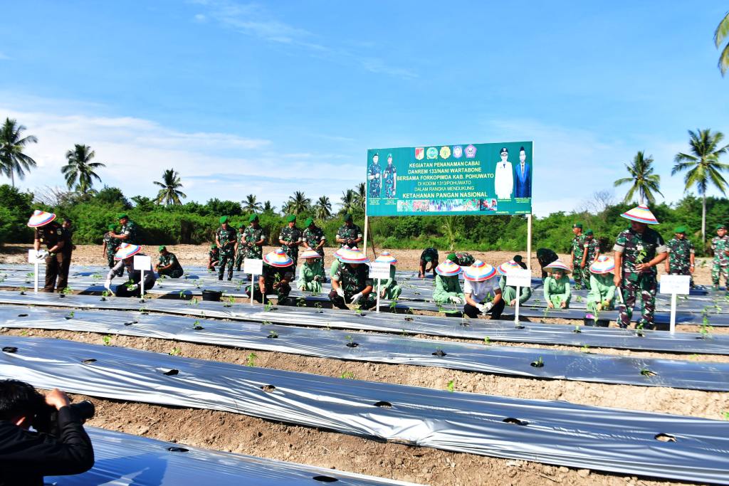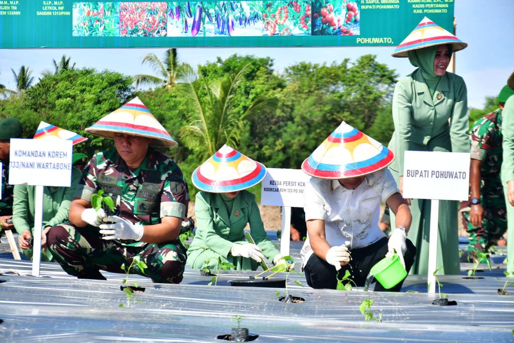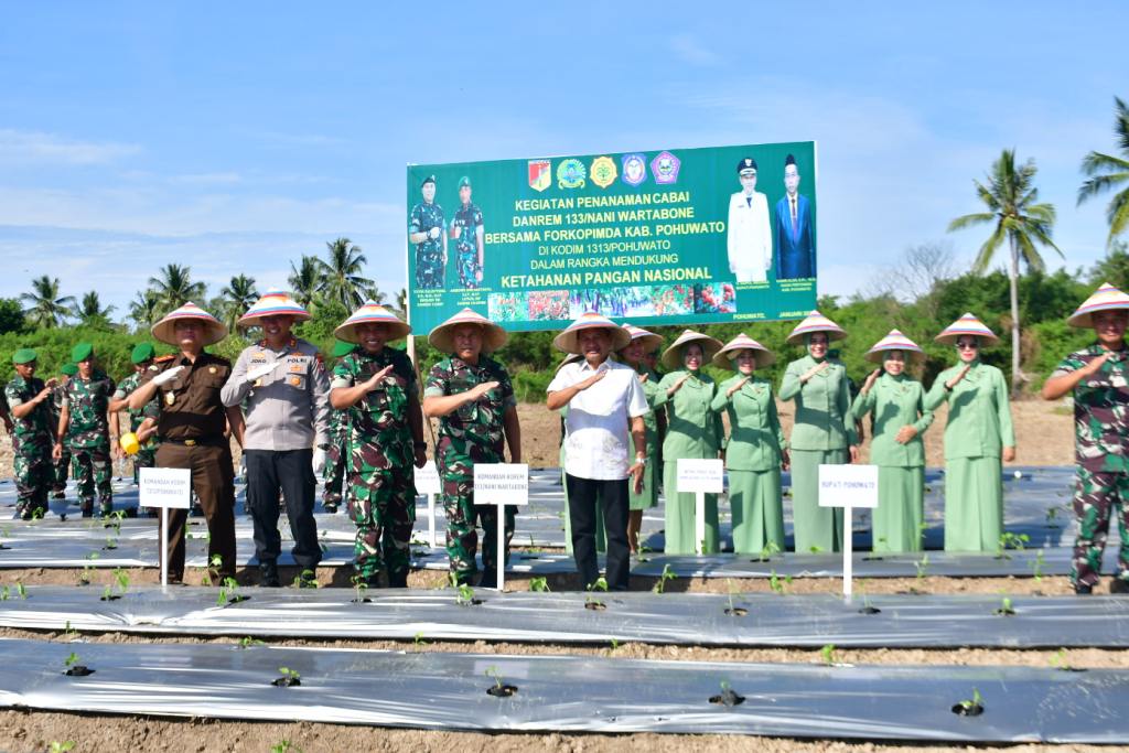 Usai penerimaan secara adat gorontalo, Komandan Korem (Danrem) 133 Nani Wartabone, Brigjen TNI Totok Sulistyono bersama Bupati Pohuwato, Saipul A. Mbuinga, Kapolres, Kajari, Dandim 1313, melakukan penanaman cabai di Kodim 1313 Pohuwato.