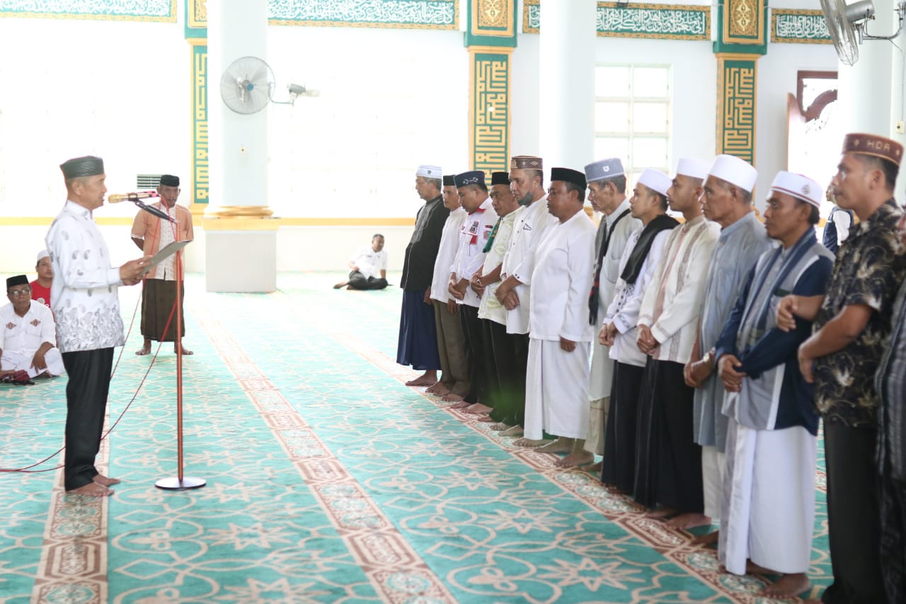 Usai pengukuhan dilanjutkan dengan penyerahan administrasi oleh Bupati Saipul Mbuinga kepada Ketua Takmirul Masjid, Ahmad Djuuna.